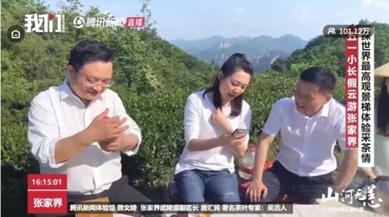 红网时刻武陵源5月5日讯(通讯员 邓道理)5月3日,腾讯新闻、新京报、湖南经视三大媒体通过网络直播,以《探寻世界最高观景梯 体验景区采茶情》为题,带领100多万名网友云游世界自然遗产张家界武陵源风景名胜区。著名茶叶专家吴浩人、张家界市武陵源区人民政府副区长唐汇民现身天子山景区御茶园,向广大网友推介天子山御茶、鱼泉贡米、菜葛等农特产品,扩大线上线下销售,助力当地农民打赢脱贫攻坚战,决胜全面建成小康社会。
