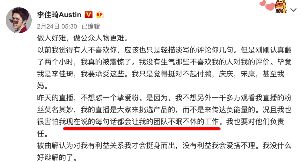 就像李佳琦说的“做公众人物很难”,自己一句不合适的话可能会让团队不眠不休的工作。任何发言都可能被赋予不同的解读,“真心”可能被人与“利益”挂钩,出了状况哪怕是真心悔过知错,也很大可能被曲解成是为了利益,为了及时止损不得已而为之。