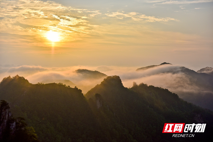 5月5日6时,世界自然遗产张家界武陵源风景名胜区天子山景区出现云海美景,在金黄色的晨光照射下,厚厚的云层仿佛染上了一层金边,缠绕在山峰之间,色彩斑斓,气象万千,如诗如画,宛若仙境,尽显大自然的奇幻之美。