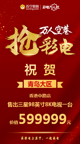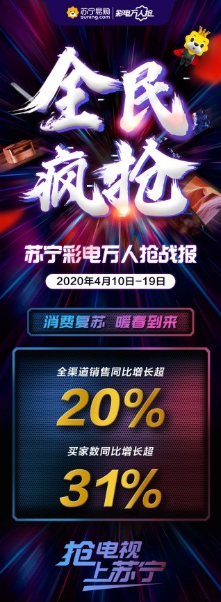 与此同时,苏宁彩电万人抢期间,全渠道销售同比增长超20%,买家数同比增长超31%,苏宁推出的千台大屏半价抢受到关注秒被抢空,70英寸及以上超大屏电视激增168%,除了超大屏的观影优势,万元左右的高配平价巨幕电视也更符合消费者的预期。418当天,苏宁易购门店售出最贵大屏电视三星98吋8K,价值599999元。影剧院暂不开业,在家看影院成为新风潮。