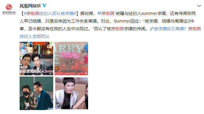 对此,经纪人Summer否认称:“被求婚、结婚与离婚这3件事,至今都没有在我的人生中出现过”。当事人已经辟谣了,所有大家谨慎吃瓜。小编觉得大家还是不要太过于关注萧敬腾个人的私生活了,还是多多关注音乐吧。