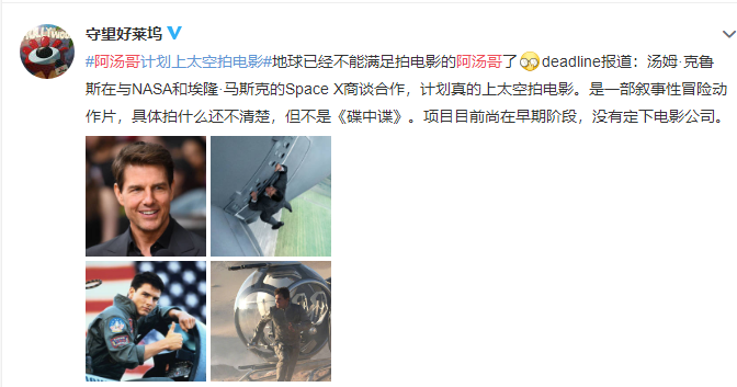 据了解,该片不是《碟中谍》系列电影,埃隆·马斯克的Space X将提供飞船,汤姆·克鲁斯将前往外太空进行拍摄和表演。