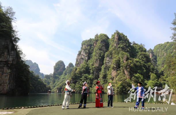 “五一”小长假首日,张家界武陵源宝峰湖景区内,游船和桑植民歌穿行荡漾于绿水青山,宁静中“声”出闹热气息。
