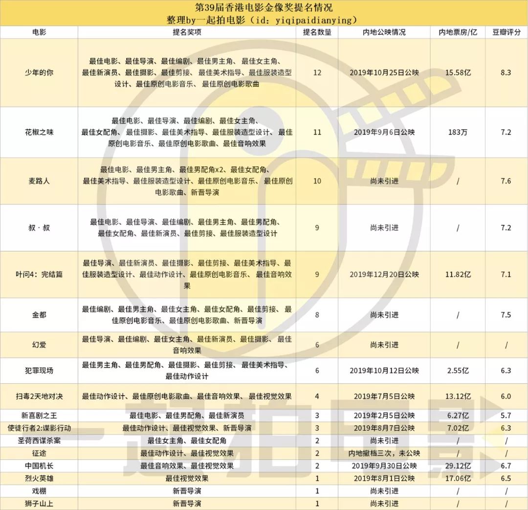 17部影片中,一共有9部电影在去年于内地公映过,总计获得了超过102亿的票房成绩,其中《扫毒2天地对决》更是以13.12亿的票房成绩,刷新港片在内地的票房成绩。口碑方面,12部有豆瓣评分的影片,11部豆瓣成绩都在6.0分及格线以上。提名数量方面,《少年的你》《花椒之味》《麦路人》分别以12项、11项和10项提名领跑。