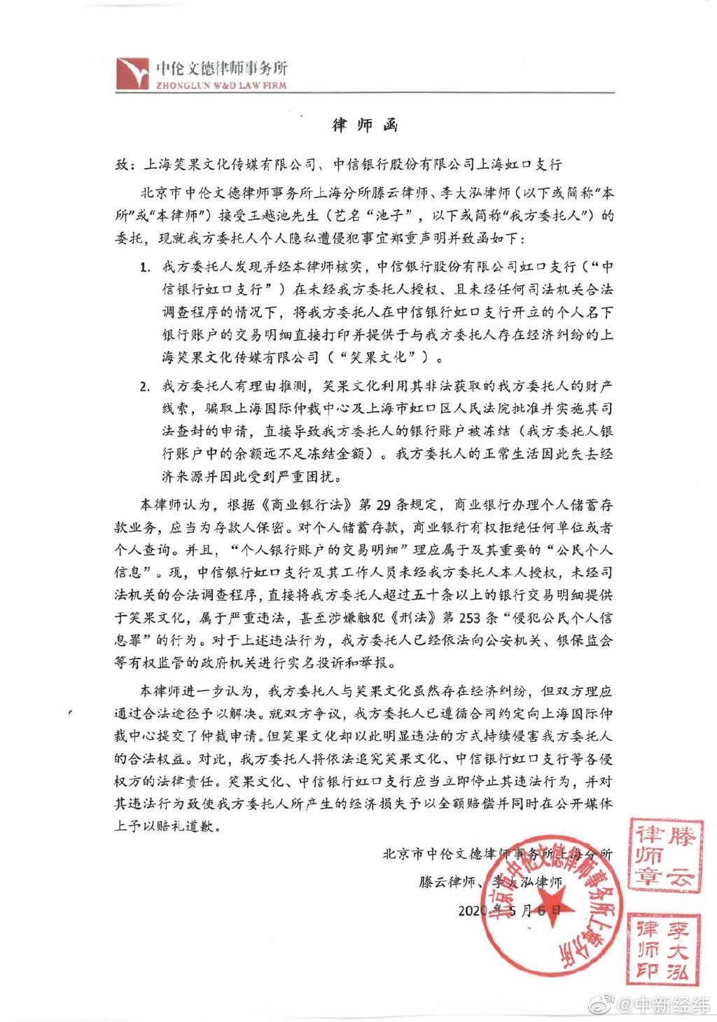5月6日,池子发长文斥笑果文化侵权,称在经纪合约纠纷案中,笑果文化寄给他的材料含有他的银行的个人账户交易明细,属于侵犯公民个人信息。目前已经报案做了笔录,同时向银保监会等政府监管机关投诉。池子还表示笑果文化违约拖欠了很多应付的演艺报酬,他提出异议后,笑果基本上刻意停止了其一切工作,多次提出和平解约无果,他只能提出仲裁,却被索赔3千万。