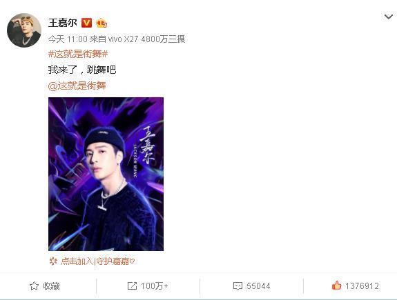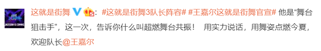 随后,《这!就是街舞3》官方微博转发该微博,并表示:他是“舞台狙击手”,这一次,告诉你什么叫超燃舞台共振! 用实力说话,用舞姿点燃今夏,欢迎队长王嘉尔。