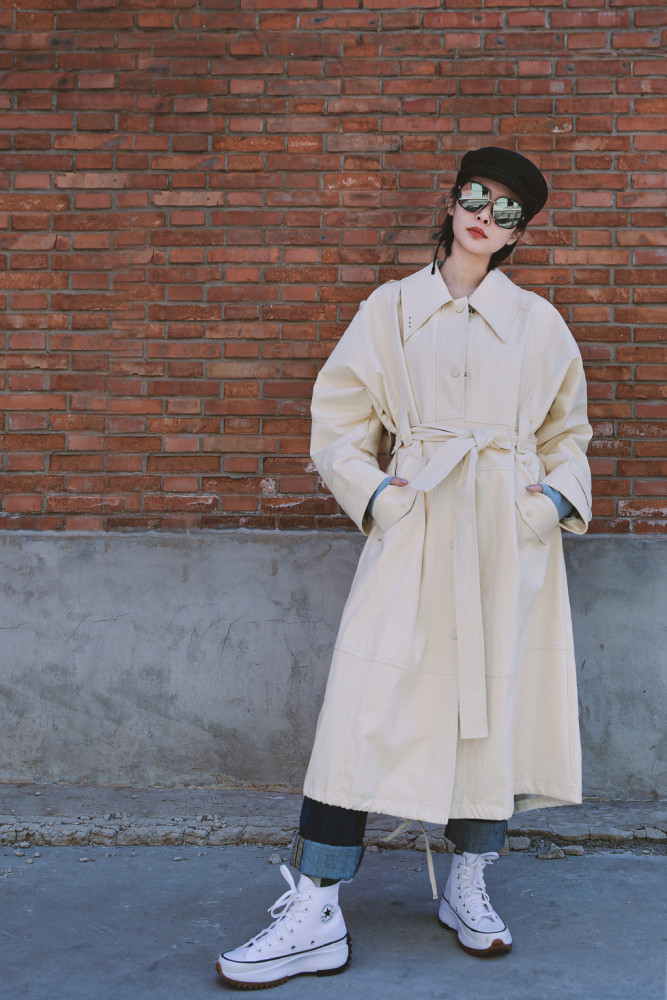 李纯还戴了副大大的墨镜,与报童帽的组合,简直太有型了,将风衣的门襟闭合,系上腰带,潇洒大气,风采凛凛。