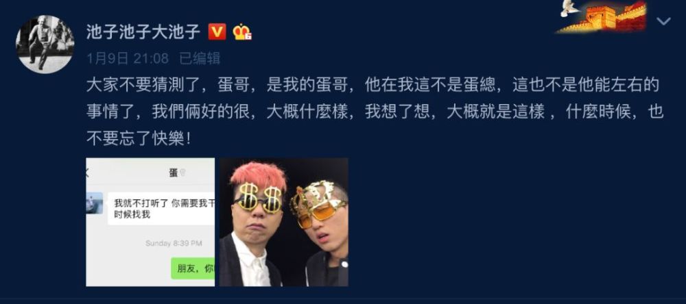 手撕笑果之后,池子发微博称在他这里李诞不是蛋总,而是他的蛋哥,用这样的方式试图停止网友对他们关系不和的猜测。其实这样也挺好,没有公司上下级的关系,池子和李诞之间作为朋友和知己的关系或许更为纯粹一些。毕竟,兄弟是用来挺的,不是用来管的。