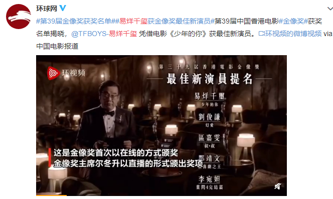 鉴于新冠肺炎疫情的影响,第39届香港电影金像奖于5月6日下午3点通过网络揭晓19个奖项的最终归属。获得12项提名的《少年的你》拿下最佳影片、最佳导演、最佳编剧8个奖项,其中28岁的周冬雨以此片首次获得金像奖最佳女演员奖。19岁的易烊千玺以此片获得最佳新人奖。