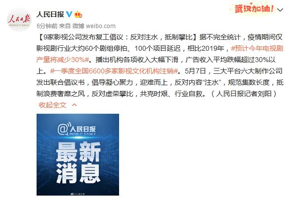 原标题:9家影视公司发布复工倡议:反对注水,抵制攀比