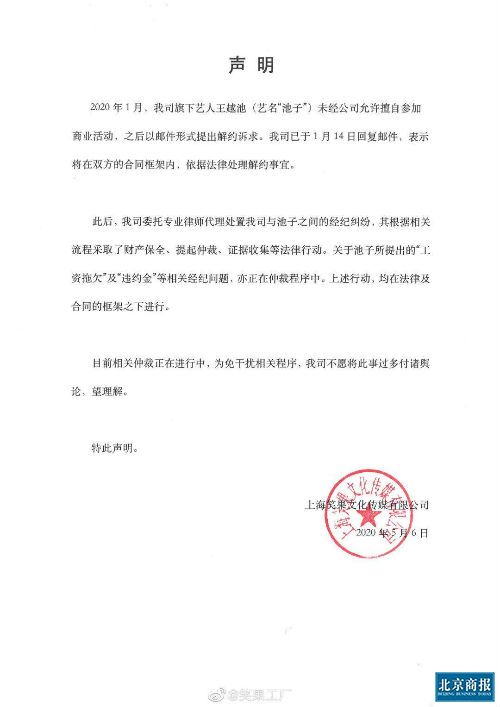 北京商报记者第一时间联系到笑果文化方面,相关负责人表示,“我司已委托专业律师代理处置我司与池子之间的经纪纠纷,其根据相关流程采取了财产保全、提起仲裁、证据收集等法律行动。关于池子所提出的‘工费拖欠’及‘违约金’等相关经纪问题,亦正在仲裁程序中。上述行动,均在法律及合同的框架之下进行。为免干扰相关程序,我司不愿将此事过多付诸舆论。