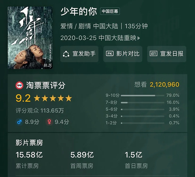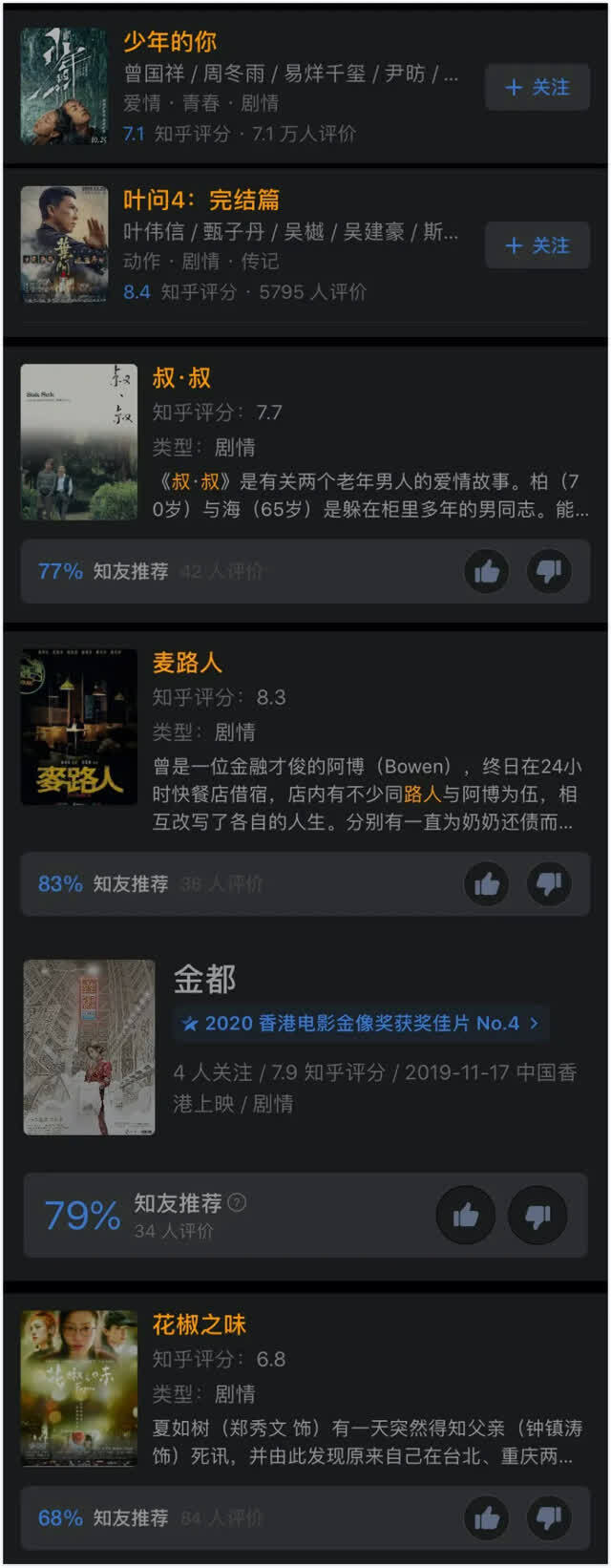 作为一个知名度的简单参考——知乎评价人数上《少年的你》是71660人,《叶问4》5795人、《叔叔》是42人,最佳男配得主《麦路人》36人,《金都》34人,同样在大陆公映过的《花椒之味》仅有84人。