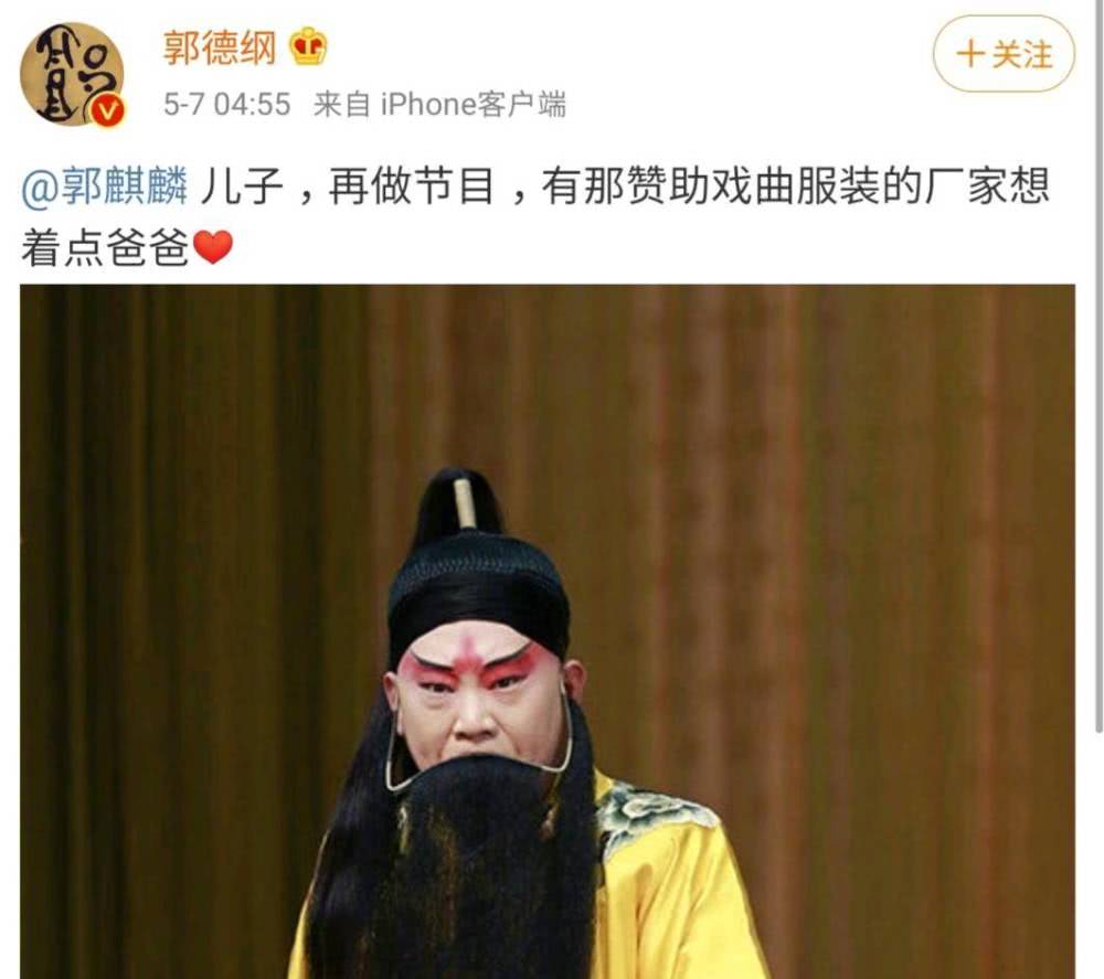 5月7日,郭德纲在社交平台晒出一张自己穿戏服的照片,并喊话儿子郭麒麟:“儿子,再做节目,有那赞助戏曲服装的厂家想着点爸爸”,并配上爱心的表情,喊话儿子帮自己拉赞助,搞笑十足。