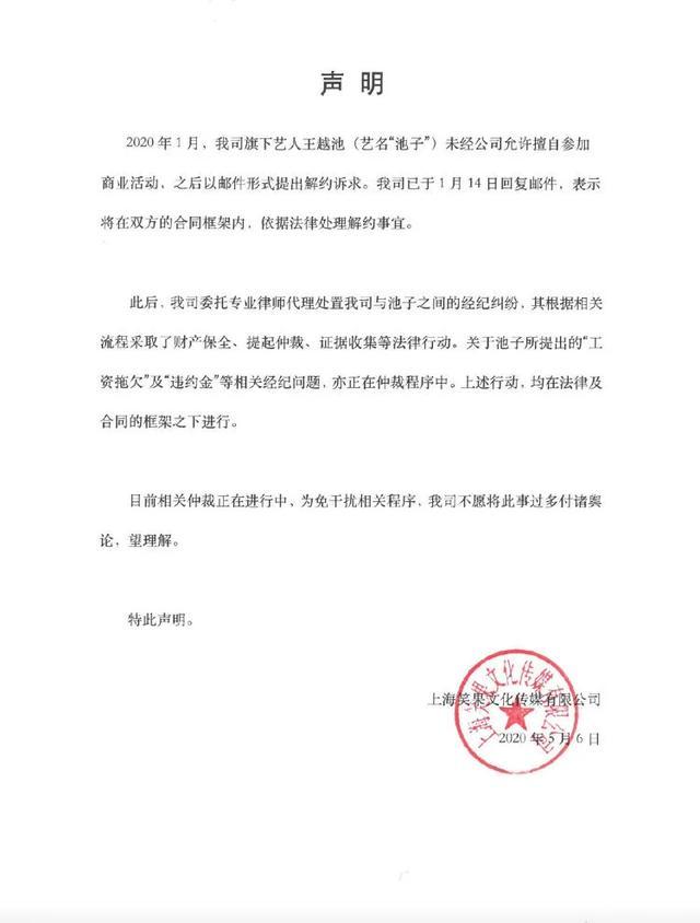 在不久前池子发的长文中,对公司肮脏的陈述是,笑果文化违约,拖欠了很多应付的演艺报酬,而且没有按照合同给池子账单明细,池子提出异议后,公司便刻意停了他所有的工作,池子的和平解约笑果并不同意。