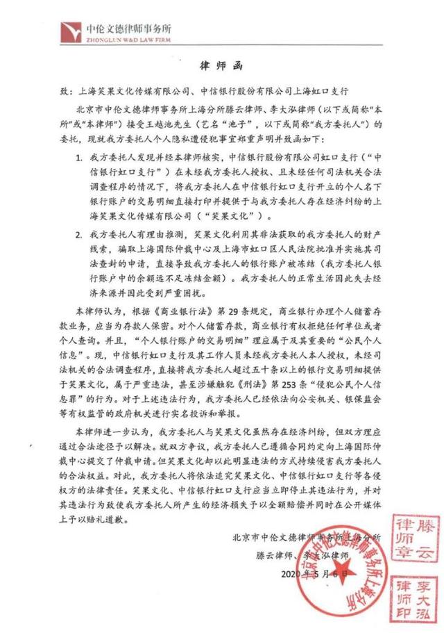 在声明最后,还附上了其通过律师发给笑果文化和中信银行上海虹口支行的律师函。从律师函内容来看,池子已经向公安机关、银保监会等机关进行实名投诉和举报。