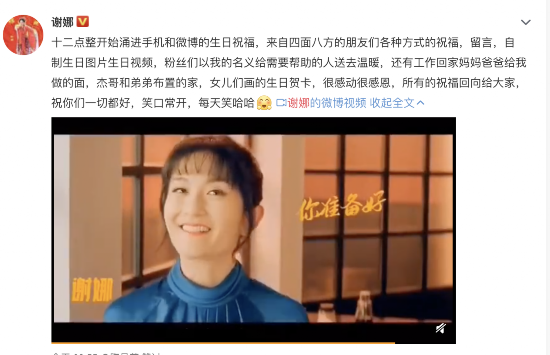 5月6日晚,谢娜在社交平台晒出自己哈哈大笑的视频感谢所有的生日祝福,也表示希望把所有的祝福回向给大家,希望大家也能一切都好。
