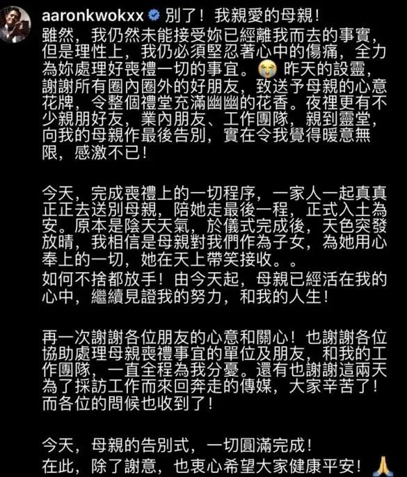 众所周知,2020年2月7日郭富城母亲去世,郭富城在香港花费百万为母亲出殡,丧礼结束后,郭富城独自深夜发文,难掩痛苦心情。