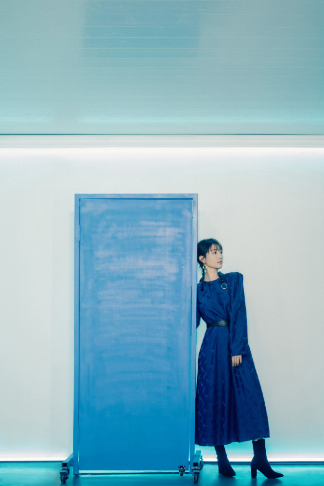 在一片翠竹前站着的白百何,穿了身花色衬衫连衣裙。水蓝色的主色调上,是肆意绽放毫无规律分布的花朵,五颜六色的花儿开在裙子上却一点儿都不让人感到杂乱,反而给人一种充满了生命力的喜悦感。一件黑巧克力色的复古灯芯绒西装外套穿在裙子外面,压制住了裙子的活泼和跳跃,犹如纯正的黑巧克力般醇厚浓郁,微微发苦,但与花香四溢五彩斑斓的裙子完美契合。
