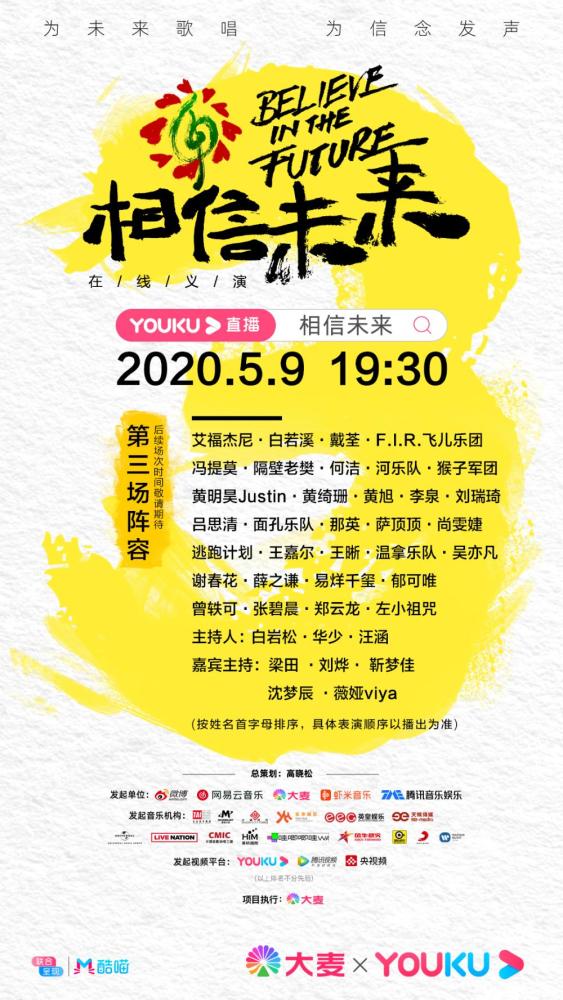 “相信未来”是由微博、网易云音乐、大麦、虾米音乐、腾讯音乐娱乐集团五大平台共同发起,音乐人高晓松担任总策划的大型线上义演。以“对抗焦虑,回归日常”为主基调,节目形式不拘一格,流行、摇滚、民谣、古典等多种音乐形态多元呈现。