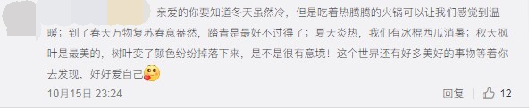 亲爱的你要知道冬天虽然冷,但是吃着热腾腾的火锅可以让我们感觉到温暖;到了春天万物复苏春意盎然,踏青是最好不过的了;夏天炎热,我们有冰棍西瓜消暑;秋天枫叶是最美的,树叶变了颜色纷纷掉落下来,是不是很有意境!这个世界还有好多美好的失误等着你去发现,好好爱自己!