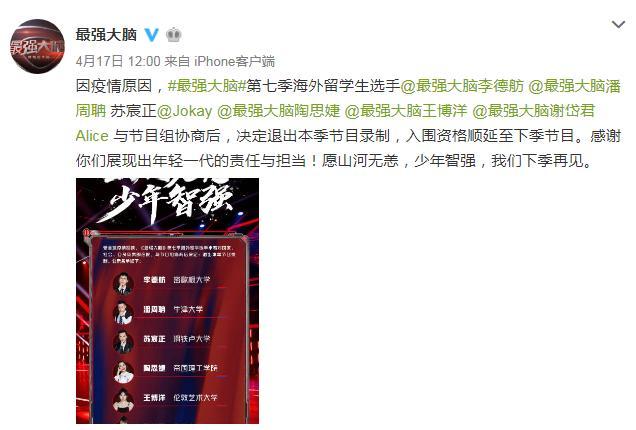 同时,节目组还表示,那些因为疫情原因不能参与本季节目录制的海外留学生选手,他们的入围资格将顺延至下季节目,下一季他们可以不必再次参与面试选拔,就可以直接参与节目的录制。这也就是说,今年不仅会有新一季的《最强大脑》,明年也还会有下下一季的《最强大脑》。