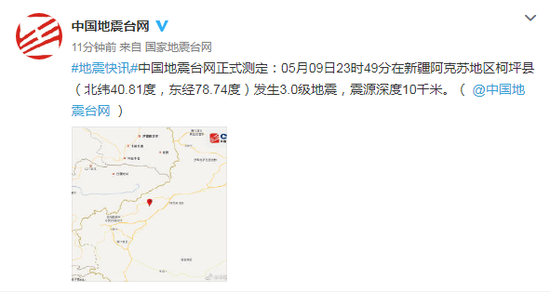 中国地震台网正式测定:05月09日23时49分在新疆阿克苏地区柯坪县(北纬40.81度,东经78.74度)发生3.0级地震,震源深度10千米。