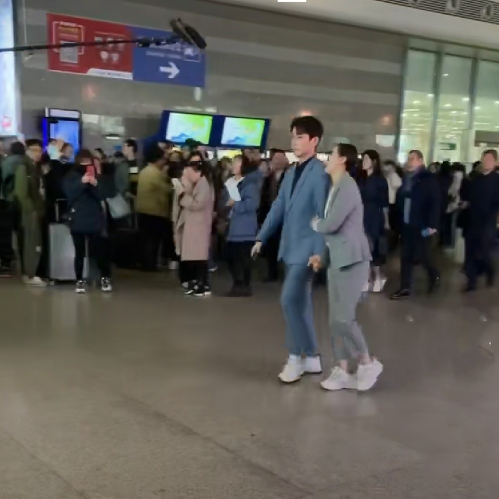 偶遇刘诗诗朱一龙机场拍戏,两人频频笑场,被人围观拍照好尴尬
