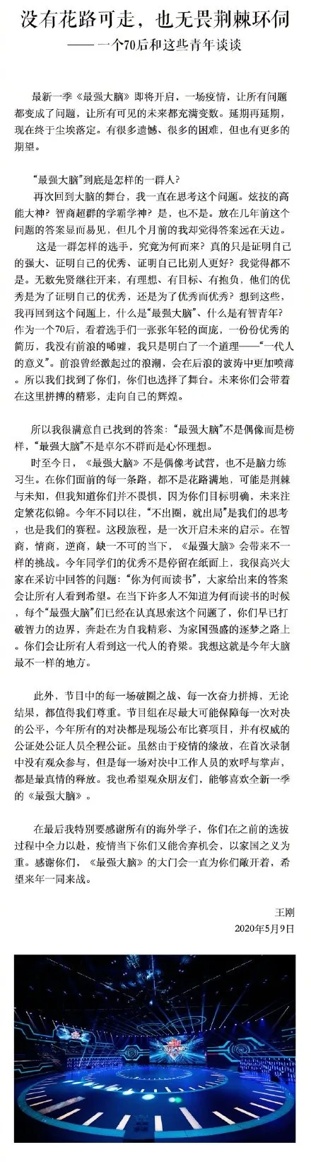 制片人王刚发布走心长文:相比卓尔不群的偶像,节目组要选拔的是心怀理想的年轻榜样。节目组也会为此加入公证人员监督,尽最大可能力保比赛公平性。