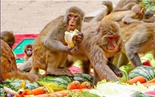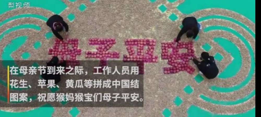 由于猕猴妈妈刚生下小猕猴不久,此时猕猴妈妈需要大量的营养,才能产出足够的奶水。同时,小猕猴也需要大量的营养才能茁壮成长。于是,景区决定为猕猴母子们准备一场大餐,以此来为猕猴妈妈们庆祝母亲节可谓是一举两得。一大早,景区的工作人员便把大量的食物摆在室外的空地上,食物包括苹果、黄瓜、花生等。为了讨个好彩头,工作人员用大量的花生在地上摆出一个巨大的中国结,并用大量的苹果在中国节中间摆出了“母子平安”的字样,寓意猕猴们平平安安、子孙兴旺。