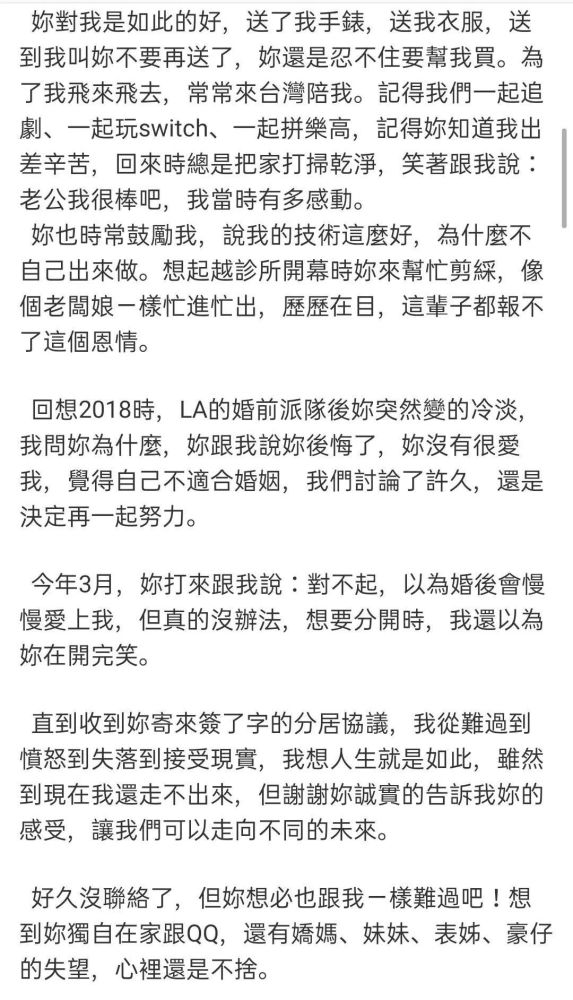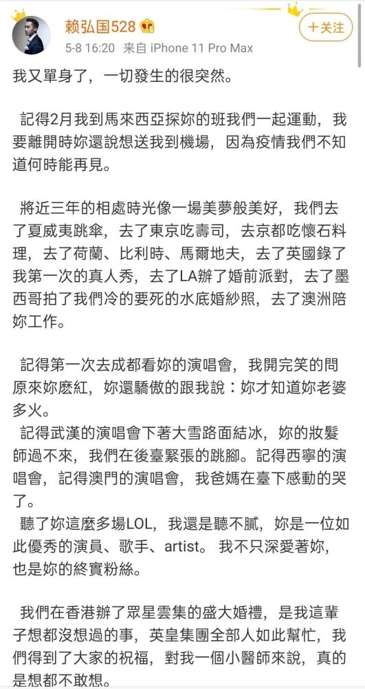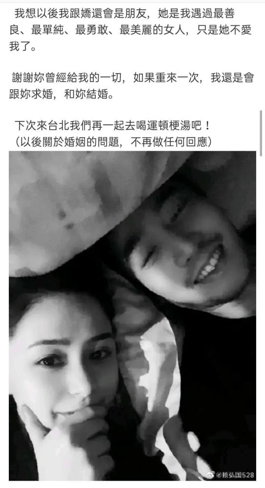 先是媒体爆料说两人已经于3月1日离婚,接着是赖弘国在个人微博公开回应,写了长文回忆和阿娇过往的甜蜜,末了,承认两人已打算结束结婚关系。