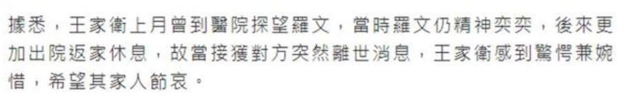 此前,王家卫曾经在上个月去医院探望过罗文导演,并表示当时的罗文看起来还非常有精神,而且之后还出院回家休养了,还以为罗文治疗成功了。没想到时隔一月就突然离世,感到非常震惊以及惋惜。