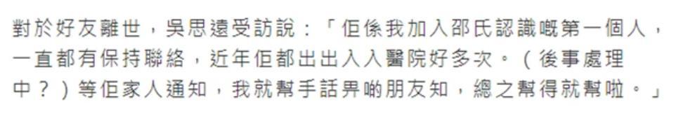 罗文的好友吴思远在接受采访的时候表示,这几年和罗文经常有联系,期间罗文也住院有几次,身体一直都不太好,如今吴罗文去世了,如果他家人有需要的,能帮忙的就会帮忙。