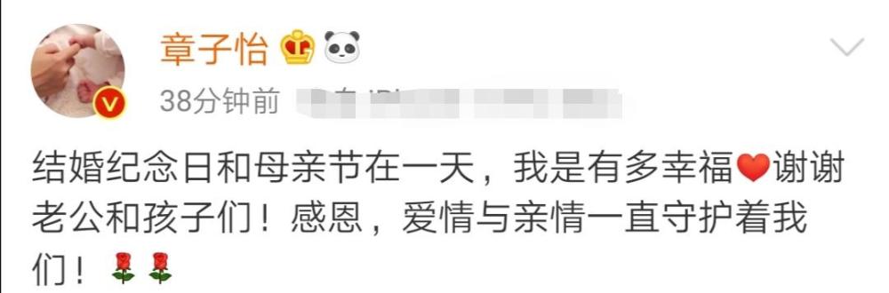 并配文表示:结婚纪念日和母亲节在一天,我是有多幸福。谢谢老公和孩子们,感恩爱情与亲情一直守护着我们。