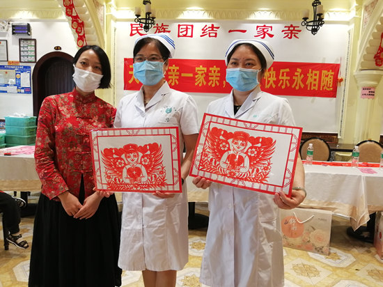 钟昀睿老师向医护工作者赠送手工剪纸。广西新闻网记者 蒋尧 摄