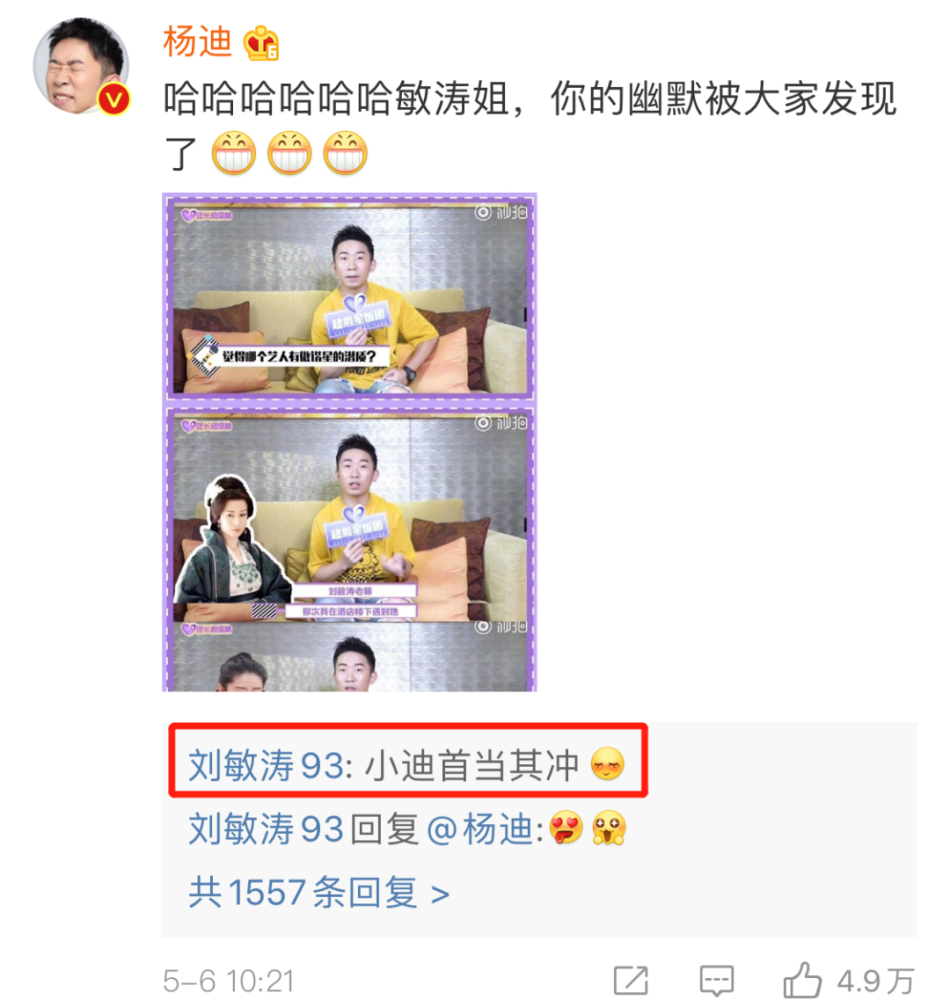 刘敏涛老师还回复了杨迪,“小迪首当其冲。”