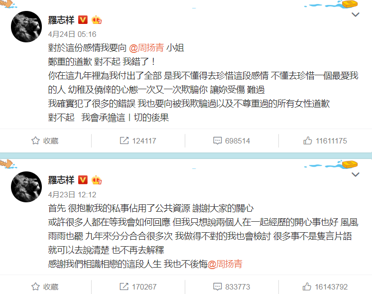 在周扬青发文后二十四小时内,罗志祥连发两文致歉。然而并未得到周扬青的原谅,被多平台取关并被暗怼洗白。与此同时,罗志祥被锤私生活混乱,事业受到严重打击。
