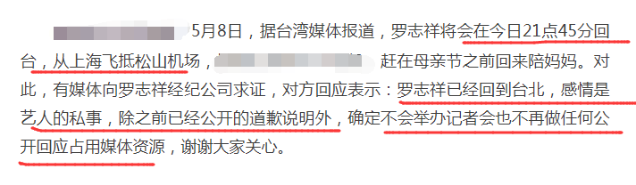 目前网传罗志祥事业唯一退路留给了《娱乐百分百》,而罗志祥昨日确实偷偷赶回台湾。但罗志祥此次回去,并不是为了录制《娱乐百分百》,而是为了陪妈妈度母亲节。