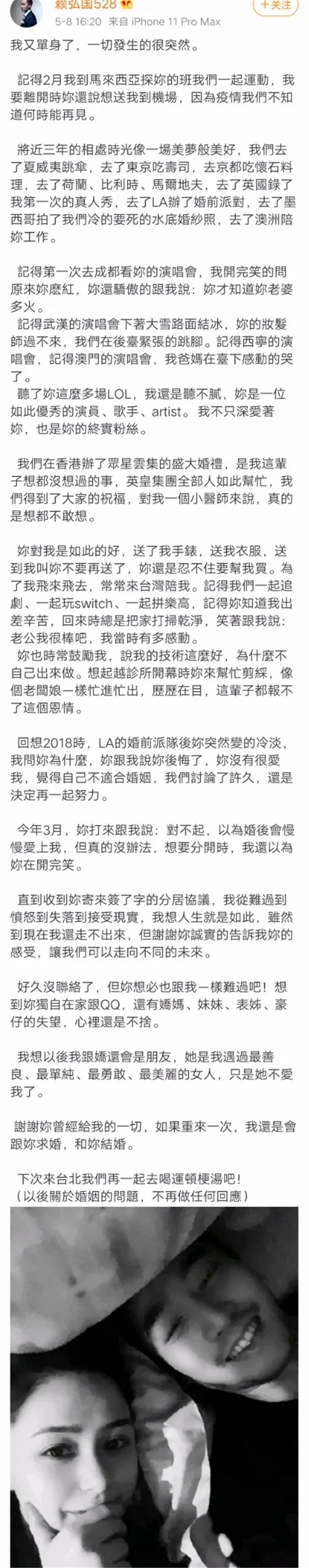 没有对双方的埋怨,也没有资产的纠缠,这是娱乐圈难得的和平离婚。