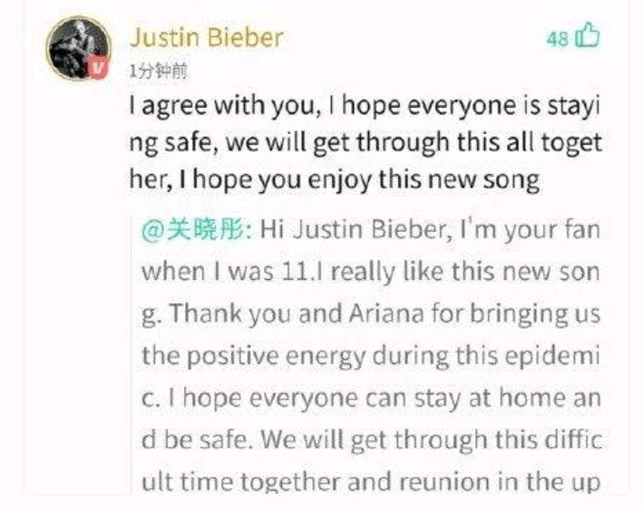 5月8日,贾斯汀・比伯与“A妹”爱莉安娜・格兰德合作新歌MV发布,关晓彤随后在新歌评论区留言,告诉贾斯汀・比伯自己从11岁就开始喜欢他,随后贾斯汀・比伯回复了关晓彤称:“我完全同意你的观点,我们会一起战胜困难,希望你享受这首歌”。