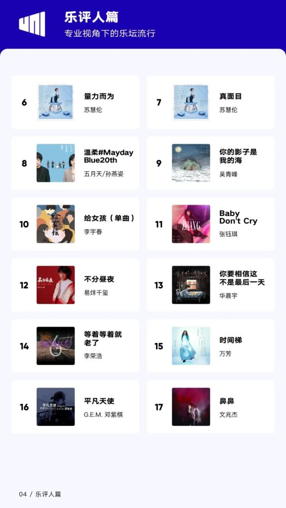 要知道“乐评人推荐榜单”是由邓柯、三石一声、流水纪、爱地人、卢世伟、赵南坊、光荣、刘尼尼等组成的乐评人评审团,以及电台DJ、音乐自媒体、音乐平台运营、唱片公司代表等组成的专业评审团共同通过勾选入围和综合评分构成的专业榜单,含金量非同小可,他们的评选标准,可以说是一条代表了不分年龄、年代、人气,只看作品质量的“金线”标准。