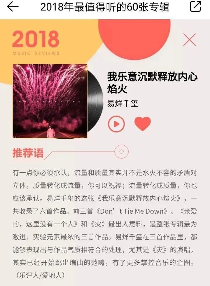 如果说,在《2020Q1华语音乐数字行业季度报告》中他登上“乐评人推荐榜单”是偶尔一次的崭露头角;但翻看由你音乐榜的《华语数字音乐2019年度报告》,你会发现他的作品其实一直在被乐评人推崇。