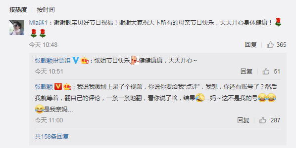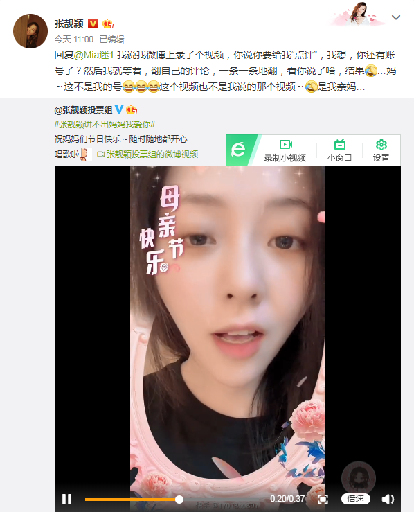 张靓颖也晒出了视频祝妈妈们节日快乐,并即兴唱了一首《听妈妈的话》来表达自己的心情,不过她的妈妈留言感谢时,却跑错了号,让张靓颖大呼:“这不是我的号,是我亲妈”,特别的有趣又有爱。