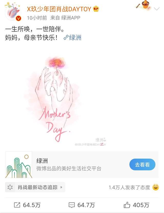5月10日是母亲节,各位明星都在社交平台上向自己的母亲表白,低调了很久的肖战也在微博发文:“一生所唤,一世陪伴。妈妈,母亲节快乐!”,并配上了一副非常精巧的手绘,足以看出他的孝心。