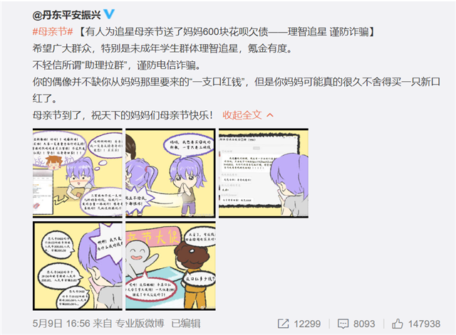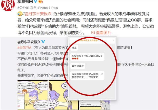 母亲节当天,丹东警方在微博发文提醒肖战粉丝要理性追星,并举例有人为了追星在母亲节送了妈妈600元花呗欠款,而发生这些行为的基本都是没有收入的未成年人。该网警指出,“你的偶像并不缺你从妈妈那里要来的一只口红钱,但是你妈妈可能真的很久不舍得买一只新口红了”。然而这则微博发布之后,有肖战的粉丝就对该网警进行了辱骂,内容不堪入目。