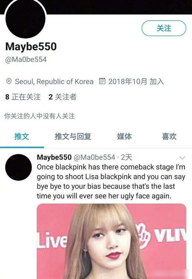 而这个威胁账号被网友发现后也在各大社交媒体上引发热议,BlackPink更是纷纷表示经济公司要保护好Lisa的人生安全。