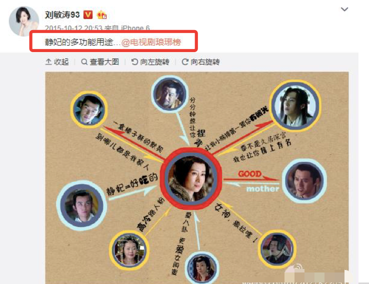 刘敏涛还将和自己有关的人,做成以自己为中心的关系图,调侃静妃的多用途。看着刘敏涛如此幽默,开放,自如,带着几分不羁和狂野,热烈张狂的样子,让许多人羡慕。