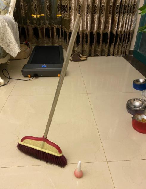 袁姗姗家的黄扫把,上等白色地板砖,跑步机,窗帘布,宠物盆和拖鞋,典型的居家范,不穷也不奢。
