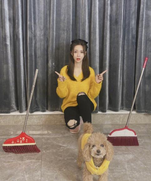 沈梦辰家的红白双扫把,本人加爱犬双双入镜,渐变色大理石地板砖,再加上厚实的灰色绒窗帘布,可以大概想象的到,家的面积应该比较大,装修应该也非常的大气,不排除与杜海涛婚房的可能性。
