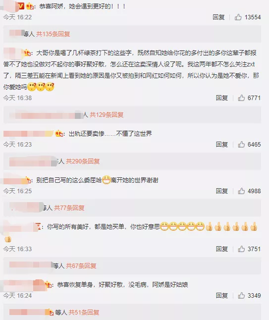 这样名存实亡的婚姻在今天选择结束,网友们反倒是替阿娇长舒了一口气,在男方深情满满的微博下面,都是网友祝福阿娇离婚的留言。