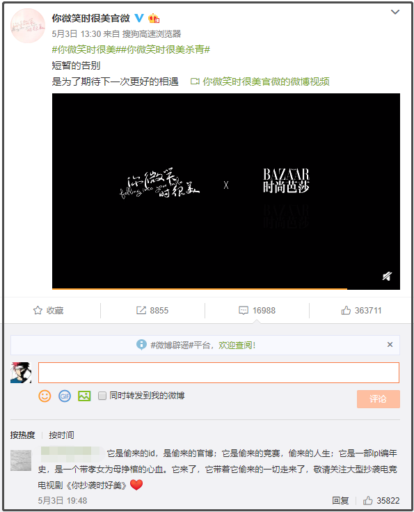 另外一边,在《你微笑时很美》官博的评论区,有人写下了这样一段评论: